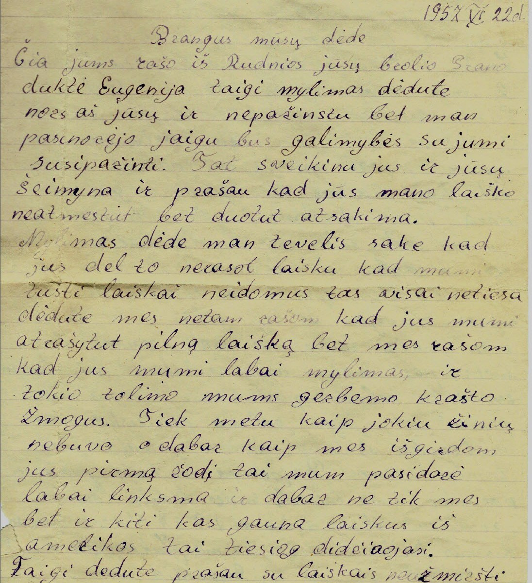 This is your brother Pranas’ daughter Eugenija writing to you from Rudnia (a small town in Lithuania, southwest of the capital Vilnius), so, my dear uncle, although I do not know you, I wanted to make your acquaintance if possible. I therefore greet you and your family and ask that you not ignore my letter but give me an answer.