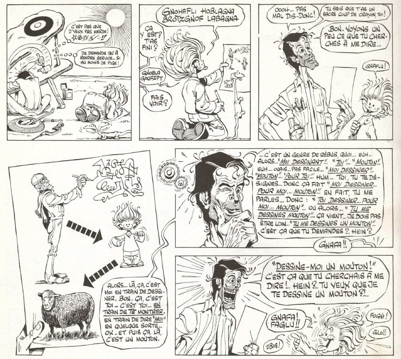 The whole thing was like a scene from Antoine de Saint-Exupéry’s Le Petit Price, when the pilot could not understand that the Prince only wanted him to draw a sheep. Here’s a wonderful satire of that scene by the French artist Gotlib. The moments of confusion and comprehension between Dad and the Metro man were kinda like this. In the satire, the Prince actually draws, quite well, what he wants the Pilot to do: