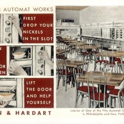 Long before McDonald’s and Burger King moved from strip mall paradises out on Highway 50 in Orlando to urban centers near Grand Central, Horn & Hardart had reigned supreme as America’s original fast food restaurant. Like the post office, the walls were covered with tiny glass windows displaying Salisbury steak, sandwiches, macaroni & cheese, pudding, or slices of cherry pie, all fed by kitchen staff behind the wall. After inserting either coin or token into the slot and turning the handle, you could raise the window and take out the delicacy.